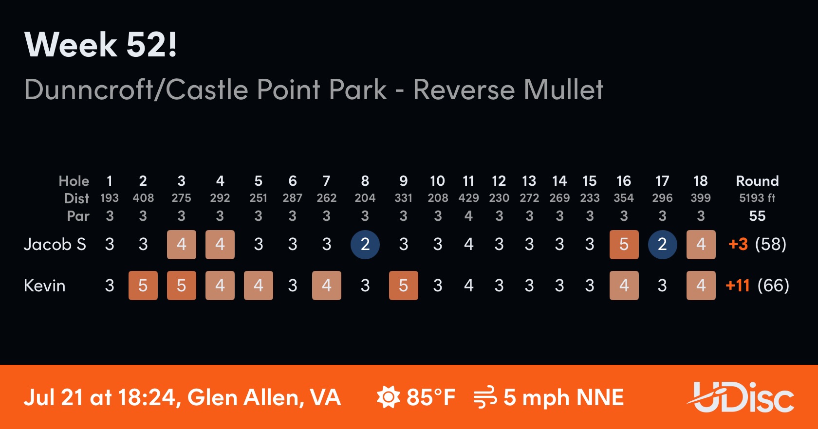 Starting with a round I played in Richmond with Kevin last July, I have played at least 1 round of disc golf in every calendar week for the past 52 weeks. I’ve improved slightly, even. It feels good!