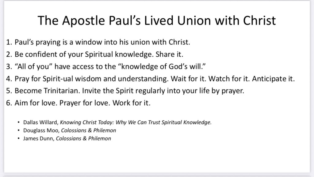 1. “…Asking that [all of] you may be filled with the knowledge of his will in all Spiritual wisdom and understanding” -Knowledge of God’s will is a deep and abiding understanding of the revelation of Christ and all that he means for the universe and us. (Douglas Moo)