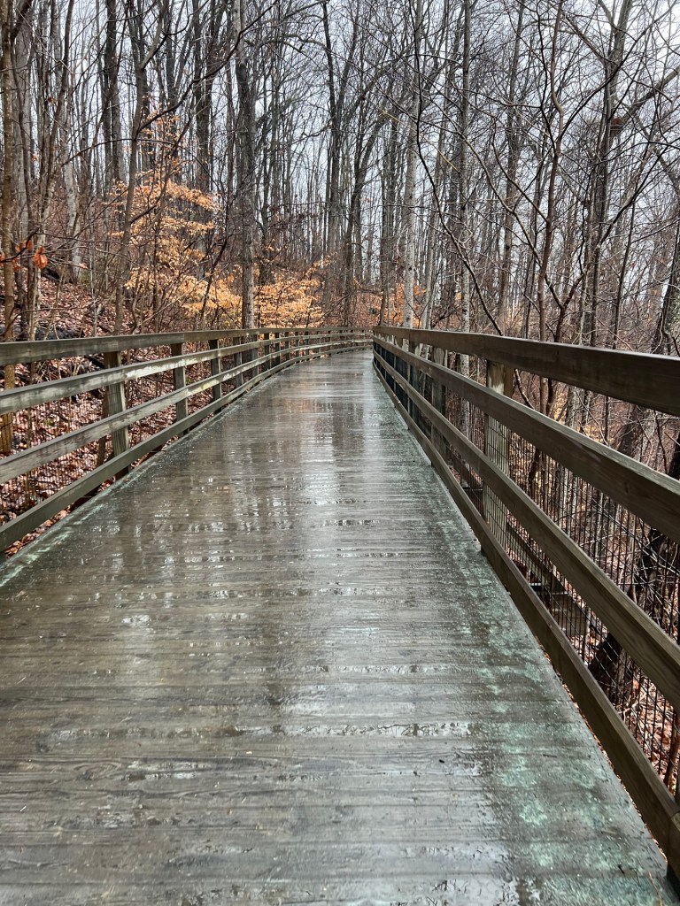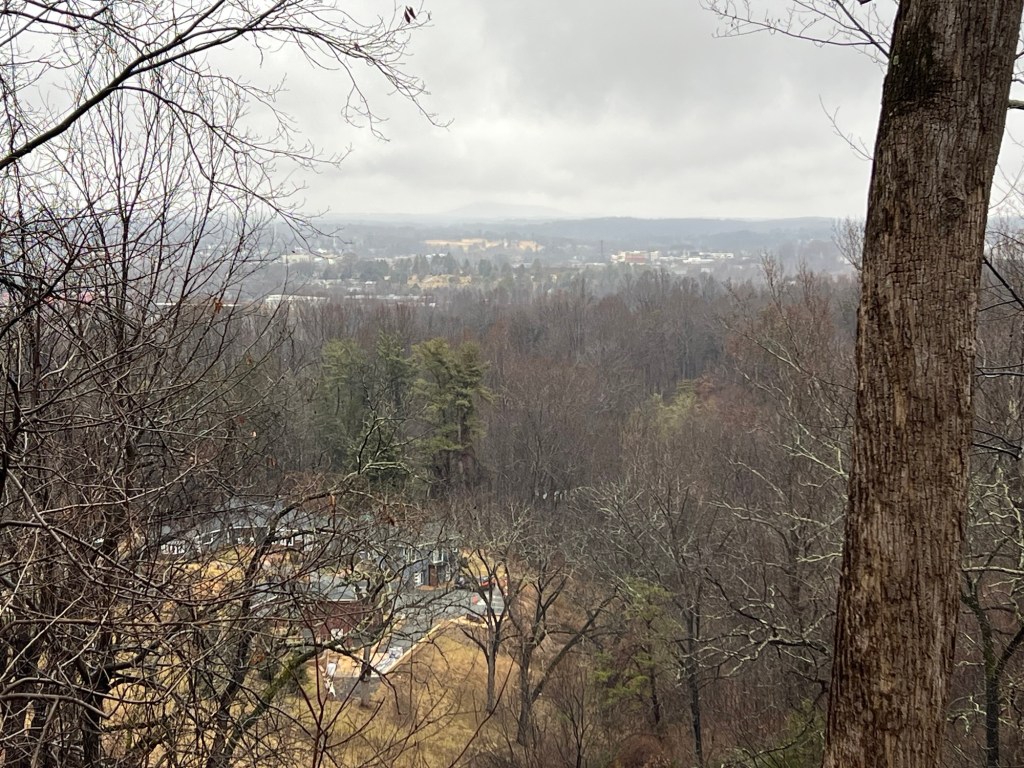 As I drove further towards Monticello I saw a boardwalk up on the hill and became enamored of the idea that there might be a public path up that way. Sure enough, I found that it led from the parking area at the Monticello visitors center. So I took a leisurely stroll in the rain in 35ish (F) degree weather and enjoyed the views of the fog and the woods. I got a bit of a nice vista of Charlottesville at one point. But mostly I got cold. However, by the end of the walk I was no longer feeling sluggish!